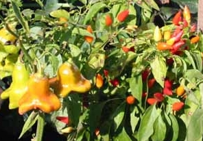 Bild: Chili 'Brazilian Starfish', Capsicum baccatum, kleine scharfe Früchte, Pflanze über 1 m hoch, gedeiht im Kübel